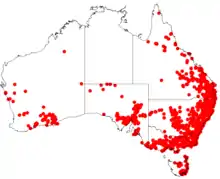 A very common and widespread species in Australia, Indigofera australis grows in a variety of different habitats, mainly open woodland and eucalypt forest, but also in desert and in the margins of rainforest. It is widespread in southern Australia from the southeastern Western Australia to northeastern Queensland.[3]