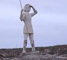 De Lisi sent the drawings to the local construction team, led by Aldo Humberto Cardozo and Alberto Sartor. The monument had been originally planned to be 10 metres (33 ft) tall, but Cardozo re-scaled it to be nearly 11 metres (36 ft), and later also added a high base of 2 metres (6 ft 7 in).[3] The completed monument, now standing at almost 13 metres (42.4 ft), depicts a native who is holding a long spear while watching the horizon.[2]