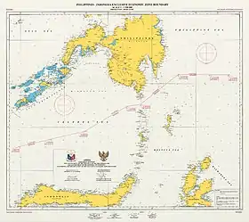 The border between Indonesia and the Philippines consists of a maritime boundary mainly on the Celebes Sea that separates the two Southeast Asian countries as defined through a pact that was signed by both parties in 2014.[1] The border is also the Exclusive Economic Zone (EEZ) boundary between Indonesia and the Philippines, which is delimited through eight geographic coordinate points.[2] It has a length of 1,162.2 kilometres (627.5 nautical miles; 722.2 miles) dividing across the Celebes Sea to the Philippine Sea.[3]