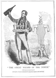 The barrel changed to a bottle in the early-19th century, when "Herr Schmidt" introduced "The Bottle of Sobriety and Inebriety" around 1821. The trick was next seen in London in 1835 by "Falck of Koenigsberg"'s "Infernal Bottle". Phillippe used a variety of this trick between 1836 and 1838. Phillippe's assistant, Macallister, claimed to have invented it. Similar acts were performed by many, including the well-known Ludwig Leopold Döbler, who is seen performing it on a poster in 1842.[2]