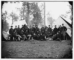 Below the regiment was the battalion, although with few exceptions there was no formal structure, only that any two or more companies constituted a battalion.[4] If a regiment was formed with only eight or fewer companies, it was referred to as a battalion.[5] The company was traditionally seen as the smallest military unit and often recruited from a local community.[11] It's authorized strength was approximately 100 soldiers, led by a captain who was assisted by a couple of lieutenants and several non-commissioned officers (NCOs). However, as with regiments the actual strength of a company was often reduced to half or less.[7][12] A company could further split into two platoons, with each divided into two sections of two squads each. The smallest sub-unit were "comrades in battle" or the four men adjacent to each other in the line of battle. Such small units rarely featured in Civil War combat with some exceptions, such as during skirmishing.[13]