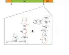Segment 7 encodes the M1 protein and the smaller M2 proton channel protein, which is produced by RNA splicing. M2 protein is critical to the virus: it forms the ion channels that allow for acidification of the virion that stimulates in un-coating. The 3' splice site region used to produce M2 was experimentally probed with structure-sensitive chemicals and enzymes and was found to adopt both the hairpin and pseudoknot conformations in solution. Each conformation places important splicing regulatory sites in different structural environments, which has implications for the modulation of splicing of the segment 7 transcript. For example, the splice site, polypyrimidine tract, branch point, and ASF/SF2 exonic enhancer binding sites are expected to be more accessible in the hairpin conformation and less accessible in the pseudoknot (Figure 1). By shifting the equilibrium between the pseudoknot and hairpin it may be possible to reduce or enhance M2 splicing, respectively.[4]