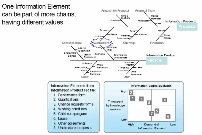 To illustrate the concept of an IP, an example is shown of a bottleneck analysis in HR (by J. Willems 2008). Here, the illustration shows how the information elements (e.g. qualifications) build up the information product (e.g. HR file).