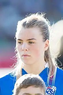 Ingibjörg grew up in Grindavík in southwest Iceland and joined the local club Grindavík at a young age. On August 17, 2011, at 13 years old, she debuted for Grindavík's senior in a match against Þróttur Reykjavík in the top-tier women's football league in Iceland.[1][2] In 2012, at the age of 14 years, Ingibjörg signed with Breiðablik, the record champions in Icelandic women's football. In August 2012, she debuted for Breiðablik senior team. Until 2016, she played alternately with the youth and senior team, then exclusively for the senior team.[3]