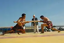 The game is played by two players, each player holding the rod under his arm, as in the game of tug of war.[5] The end of the rod should protrude for at least two inches under the armpit, and the centre of the rod must align with the centre of the circle.
