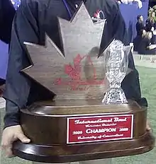 The winner of the International Bowl was presented with a trophy similar in design to the International Bowl logo. A Canadian maple leaf formed the back of the trophy, with a small crystal football set offset to the right. The name of the winning team was placed on a plaque attached to the lower part of the trophy.