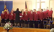 Members of the choir are Christians who are also members of their local Salvation Army church.[10] The ISS regularly visits Salvation Army centres in the UK[11] and has undertaken several international tours, including the US,[12] Canada, France, Switzerland, Estonia, Australia,[13] New Zealand,[14] Kenya, South Africa, Argentina and Uruguay.[15] Profits from recordings and performances are used to support the work of the Salvation Army.[16] The ISS has performed in diverse locations; from notable venues across the UK, including the Royal Albert Hall,[17] O2 Arena, Llandaff Cathedral, Gloucester Cathedral and Symphony Hall, to squatter camps, prisons and hostels.[15] The ISS regularly performs on the long-running BBC Radio 4 shows The Daily Service and Sunday Worship,[18][19] and has also featured on the BBC Television programme, Songs of Praise.[20][21]