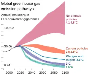 Climate change has been one of the most important and heavily debated topics in recent environmental law. The United Nations Framework Convention on Climate Change, intended to set out a framework for the mitigation of greenhouse gases and responses to resulting environmental changes, was introduced in 1992 and came into force two years later. As of 2023, 198 states were a party.[177][178] Separate protocols have been introduced through conferences of the parties, including the Kyoto Protocol which was introduced in 1997 to set specific targets for greenhouse gas reduction and the 2015 Paris Agreement which set the goal of keeping global warming at least below 2 °C (3.6 °F) above pre-industrial levels.[179]