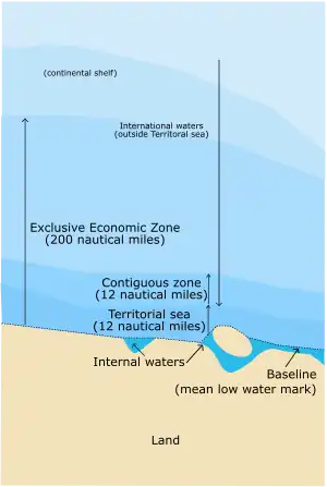 The boundaries of a nation's territorial sea were initially proposed to be three miles in the late 18th century.[187] The UNCLOS instead defined it as being at most 12 nautical miles from the baseline (usually the coastal low-water mark) of a state; both military and civilian foreign ships are allowed innocent passage through these waters despite the sea being within the state's sovereignty.[188][189] A state can have jurisdiction beyond its territorial waters where it claims a contiguous zone of up to 24 nautical miles from its baseline for the purpose of preventing the infringement of its "customs, fiscal, immigration and sanitary regulations".[190] States are also able to claim an exclusive economic zone (EEZ) following passage of the UNCLOS, which can stretch up to 200 nautical miles from the baseline and gives the sovereign state rights over natural resources. Some states have instead chosen to retain their exclusive fishery zones, which cover the same territory.[191] There are specific rules in relation to the continental shelf, as this can extend further than 200 nautical miles. The International Tribunal for the Law of the Sea has specified that a state has sovereign rights over the resources of the entire continental shelf, regardless of its distance from the baseline, but different rights apply to the continental shelf and the water column above it where it is further than 200 nautical miles from the coast.[192]