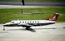 In 1986, Interot Airways commenced scheduled passenger flights on the Augsburg–Düsseldorf route, using its then two Beechcraft Super King Air.[2][3] In 1987, three Beechcraft 1900 were ordered,[4] and the fleet was further expanded following an order for three aircraft of the larger Dash 8-100, which were delivered in 1991–92.[5] By then, the domestic route network at Augsburg Airport had grown to include Berlin, Cologne, Dresden, Hamburg and Leipzig[3] so that Interot Airways was considered an alternative for business travellers who wished to avoid busy Munich Airport.[6]