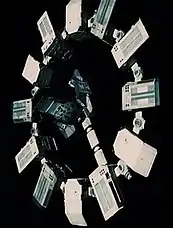 The film features two robots, CASE and TARS, as well as a dismantled third robot, KIPP. Nolan wanted to avoid making the robots anthropomorphic and chose a 1.5 m (4.9 ft) quadrilateral design. He said: "It has a very complicated design philosophy. It's based on mathematics. You've got four main blocks and they can be joined in three ways. So, you have three combinations you follow. But then within that, it subdivides into a further three joints. And all the places we see lines—those can subdivide further. So you can unfold a finger, essentially, but it's all proportional." Bill Irwin voiced and physically controlled both robots, with his image digitally removed, and Josh Stewart replaced his voicing for CASE.[9] The human space habitats resemble O'Neill cylinders, a theoretical space habitat model proposed by physicist Gerard K. O'Neill in 1976.[44]