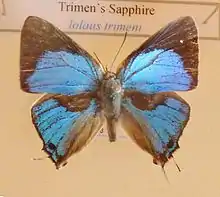 Iolaus trimeni, the Trimen's sapphire, is a butterfly of the family Lycaenidae. It is found in the southern Democratic Republic of the Congo, south-eastern Angola, Zambia, Tanzania, Malawi, Zimbabwe, Mozambique, Swaziland and South Africa. In South Africa it is found from northern KwaZulu-Natal to Mpumalanga, Gauteng and the North West province.
