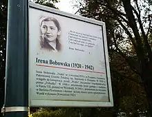 Irena Bobowska (3 September 1920 – 27 September 1942) was a Polish poet and member of the Polish resistance. Her callsign was "Otter". Though paralyzed from the waist down by childhood illness she participated in the resistance to the German occupation of Poland, before capture and execution at the age of 22.