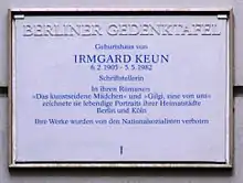 Irmgard Keun ([ˈɪʁmɡaʁt ˈkɔɪ̯n]; 6 February 1905 – 5 May 1982) was a German novelist. Noted for her portrayals of the life of women, she is described as "often reduced to the bold sexuality of her writing, [yet] a significant author of the late Weimar period and die Neue Sachlichkeit."[1] She was born into an affluent family and was given the autonomy to explore her passions. After her attempts at acting ended at the age of 16, Keun began working as a writer after years of working in Hamburg and Greifswald. Her books were banned by Nazi authorities but gained recognition during the final years of her life.