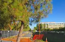 In February 2011, the Pleasanton City Council voted to ratify the EBRPD master plan, based on public meetings held the previous year, to complete the trail within the city. $4 million in regional and federal grants was allocated to complete the BART-to-Santa Rita section of the trail.[7] Construction began in May 2013,[8] and was completed in July 2014. The project accommodated several obstacles, including routing through an existing business campus, two city parks, a residential development, an apartment complex, and three at-grade crossings of busy roads; it connects with the earlier southern segment at the intersection of two major streets.[9]