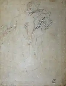 In 1964, the drawing was re-mounted in preparation for its inaugural showing at the 1965 "Masterpieces of the Print Room" exhibition at the British Museum.[7] The removal of the mount revealed a rough sketch in red and black chalk of a bearded man with hat standing beside a woman and a small child. This sketch is upside-down relative to the front side.