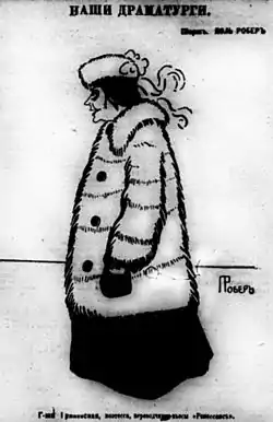 Grinevskaya's career as a dramatist began with Ogon'ki (lit. 'The First Storm'), a Russian one-act play which debuted on 2 April 1895 at the Alexandrinsky Theatre in St. Petersburg, starring Maria Savina.[10] This was followed by a series of one-act lyrical comedies (Work Day, A Dance Lesson, Play for Departing, The Letter, They've Agreed, The Conflagration, Bear Hunting, and Letter from the Village), which were performed on the stages of the Imperial Theatres.[11][12] She also produced, among others, translations of Lucjan Rydel's Zaczarowane koło, Gerolamo Rovetta's La Realtà, and Gabriele D'Annunzio's La città morta,[13] the latter of which was staged at the Alexandrinsky.