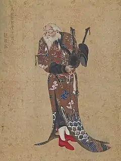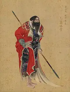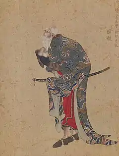 | Chousama (超殺麻), chieftain of Urayasubetsu | with European stockings and shoes under his fur-lined Ezo nishiki robe,[4]: 100 he wears blue bead and cloth tassel earrings and holds a hoe-shaped helmet ornament[1]: 121 (as does the chieftain Tobu in Kakizaki Hakyō's 1783 portrait (see Gallery below)) | ![]() | |