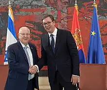 The diplomatic relations between Israel and Serbia were established on January 31, 1992, when Serbia was part of FR Yugoslavia (Serbia and Montenegro). Israel has an embassy in Belgrade and Serbia had an embassy in Tel Aviv.[1] Yugoslavia was the second country in Europe to recognize Israel in 1948.[2] The two countries have economic and cultural ties, helped by a sizable community of Jews from the former Yugoslavia in Israel. Serbia agreed to move its embassy to Jerusalem on 4 September 2020 but decided not to after Israeli recognition of Kosovo as a sovereign state.[3][4]