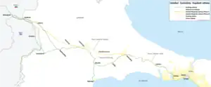 The Istanbul–Kapıkule railway is a 229 km (142 mi) long rail line currently under construction in Turkey. Once finished, this railway will provide a high-speed rail link between the Istanbul suburbs and the Bulgarian border, just West of Edirne. The rail line will be double tracked and electrified for its whole length, and is intended for use by both freight and passenger rail. The railway will allow for high-speed rail service between Edirne and Istanbul, and is intended to strengthen the rail transport link between Turkey and Europe.[1] The rail line is planned to open in 2024.