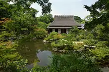 The site of the western garden originally formed part of Manishu-in, a minor temple which was part of the larger temple of Kofuku-ji. The ground was bought in the 1670, during the Enpō era by Kiyosumi Michikiyo, a wealthy tanner.[2] He restructured the gardens between 1673 and 1681 and built two houses: the Sanshu-tei and Tei-shu-Ken, as the family home. These were built with thatched roofs. The name Sanshu-tei ("house of the three wonders") was given by Mokuan, the large priest of the Manpuku-ji temple of the school Zen Oubaku with Uji.