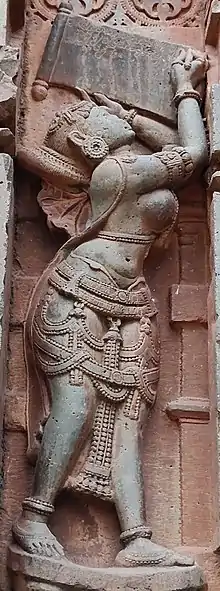 One of the main attraction of the temple sculptures is a sculpture of a lady, Shasana Sundari (Shilabalika), a mythological woman, depicted as inscribing Sanskrit epigraph in Kannada characters.[1] The figure in dancing position is seen inscribing the epigraph. The Shasanas praises Vikramaditya VI of the Chalukya dynasty. The writings is deciphered as "Saptadveepodaree Bhutam Bhutalam Sweekarishyati Chalukya Vikramaditya Saptamo Vishnuvardhanaha".[6] The translation is "Vikramaditya of Chalukya Dynasty captured and is ruling the land containing seven islands".[7] It can be noted from the posture of the figure that the body shows a twist beyond the navel as observed in belly twist (jathara parivartanasana). The neck is bent as in akashi mudra.[8]