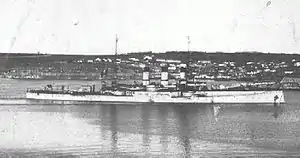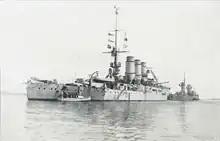 Her propulsion system consisted of two vertical triple-expansion steam engines, each driving a screw propeller. Steam for the engines was provided by twenty-eight coal-fired Babcock & Wilcox boilers that were vented into three funnels. The ship's propulsion system was rated at 21,968 indicated horsepower (16,382 kW) and provided a top speed of 21.39 knots (39.61 km/h; 24.62 mph) and a range of approximately 10,000 nautical miles (19,000 km; 12,000 mi) at 10 knots (19 km/h; 12 mph).[1][2]
