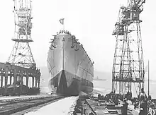 Roma's keel was laid down by the Italian shipbuilder Cantieri Riuniti dell'Adriatico on 18 September 1938, and she was launched on 9 June 1940. After just over two years of fitting-out, the new battleship was commissioned into the Regia Marina on 14 June 1942. She arrived in the major naval base of Taranto on 21 August, and was assigned to the Ninth Naval Division.[3] Although Roma took part in training exercises and was moved to various bases including Taranto, Naples, and La Spezia, in the next year, she did not go on any combat missions as the Italian Navy was desperately short of fuel. In fact, by the end of 1942, the only combat-ready battleships in the navy were the three Littorios because the fuel shortage had caused the four modernized battleships to be removed from service. When combined with a lack of capable vessels to escort the capital ships, the combat potential of the Italian Navy was virtually non-existent.[11][12]