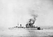 At about that time, Ilex and Havock closed to launch torpedoes at the stricken cruiser, though their initial attacks missed. Hyperion joined the two destroyers, which had launched a further round of torpedoes, one of which hit Bartolomeo Colleoni. The torpedo, from Ilex, struck forward and blew off the first 30 m (98 ft) of her bow.[16][17] Casardi circled back at 08:50 to attempt to come to her aid, but quickly determined that the situation was hopeless, so he turned back to the west and fled at high speed.[18] Hyperion then launched a torpedo that struck amidships. The second hit caused serious flooding, and Bartolomeo Colleoni quickly capsized and sank. Sydney, Hero, and Hasty continued the pursuit of Giovanni delle Bande Nere, but Ilex, Havock, and Hyperion approached the area that survivors from Bartolomeo Colleoni were afloat. They picked up 525 men between the three of them, of whom 8 died of their wounds and were buried at sea. The British had to suspend rescue efforts when Italian bombers appeared and attacked the ships. A further fifty men attempted to swim to the coast of Crete, but only seven survived to be picked up by a Greek fishing boat. Four more men, including the ship's captain, died after arriving in Alexandria, Egypt. These men were buried there, and the captains of Sydney and the destroyers served as the pallbearers. In total, 121 out of a crew of 643 were killed in the sinking.[16][17]