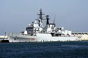 Iraq ordered four Lupo-class frigates from CNR in 1980 as part of a naval expansion program just before the Iran–Iraq War.[1] These ships, which feature a telescopic hangar were completed between 1985 and 1987. Due to restrictions on arm sales to Iraq because of the Iran-Iraq War placed by the Italian prime minister Bettino Craxi, the ships remained interned in Italy until the end of that war in 1988. Iraqi President Saddam Hussein then tried to renegotiate the price of these ships (and the other ships purchased from Italy), claiming he should receive a discount due to the delay in delivery of the ships.[1] Negotiations and court proceedings were still ongoing when Iraq invaded Kuwait in 1990 and a new arms embargo against Iraq was placed by the United Nations, again blocking the sale.[1] In 1993 all of them were seized and, after being refitted as patrol ships, incorporated to the Italian Navy as the Soldati class in 1996. Changes made for Italian service included the removal of all ASW equipment. The four ships are Artigliere (pennant F 582), Aviere (F 583), Bersagliere (F 584) and Granatiere (F 585), and are used in fleet escort or long range patrolling duties. The Philippines considered acquiring the Soldati class in 2012.[2]