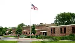 The new campus, which opened in 1960, is at 1401 North Cayuga Street in the north end of Ithaca, near Stewart Park, Cayuga Lake, and Ithaca Falls.[3] Designed by the architecture firm Perkins and Will,[4] it is a California-style campus, with 11 mostly interconnected buildings spread across a fairly wide area. Some have praised the campus as being architecturally innovative, while others have criticized it as inefficient and inappropriate to Ithaca's climate (notably as students routinely travel outdoors between classes, out of necessity or for a more direct route). The campus includes the Frank R. Bliss Gymnasium, the 840-seat Claude L. Kulp Auditorium and York Lecture Hall. Most of the Ithaca City School District's administrative offices and the Board of Education building are located on the same campus, as are the offices of the ICSD employee unions. The building is one of the few schools that use deep lake water cooling (from Cayuga Lake) for air conditioning.