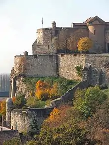 His protege Charles Martel died in August 1295, leaving Ivan without external support. Andrew III married Agnes, the daughter of Duke Albert of Austria in February 1296. Afterwards, with his father-in-law's support, Andrew launched another war against the Kőszegis in August 1296. While the Austrian troops besieged Ivan's some castles, Archbishop Lodomer excommunicated the brothers. By October, the royal army managed to capture only Kőszeg and two other forts from Ivan Kőszegi.[3] While Ivan Kőszegi remained rebellious for the remaining part of the reign of Andrew, his brother Nicholas pledged allegiance to the monarch after the 1296 rebellion, their political orientations had separated from each other.[7] Around that year the emerging Matthew Csák overshadowed the Kőszegis as the monarch's most dangerous enemies. The river Danube marked the border between the developing domains of the Kőszegi and Csák families.[45] After the close of the 1298 diet, Andrew III entered into a formal alliance with five influential barons – Amadeus Aba, Stephen Ákos, Dominic Rátót, Demetrius Balassa and Paul Szécs – who stated that they were willing to support him against the "rebellious lords", which term definitely primarily covered Matthew Csák and the Kőszegi brothers. Ivan Kőszegi still supported the claim of the House of Anjou. After his election, the pro-Angevin Archbishop Gregory Bicskei absolved Ivan and Henry from the excommunication in March 1299. Bicskei resided in Transdanubia under the protection of Ivan; he even moved to Szentkereszt Castle beyond the Drava river between Koprivnica and Križevci, owned by Ivan Kőszegi, who remained the only rebellious member of his family by that year (Nicholas died soon and Henry attended the national diet and acted as one of the mediators between Bicskei and his pro-Andrew suffragans).[46] Ivan Kőszegi was among the group of those powerful lords, who urged Charles II of Naples to send his grandson, the 12-year-old Charles Robert, to Hungary in order to become king.[47]