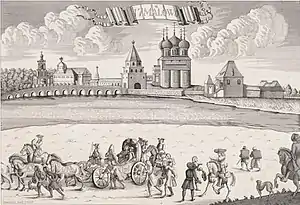 Izmaylovo was destroyed during the Time of Troubles but soon restored to its original function by the Romanov-Yuryev family. In 1655 this line of the Romanovs extinct and its properties inherited by the reigning Tsar Alexis. Alexis consolidated numerous Romanov lands into a continuous tract spanning from Yauza River in the west to Kuskovo and Pekhorka River in the east. Alexis repopulated the lands with peasants (548 households) and tradesmen (216 households) relocated from the provinces.[1]