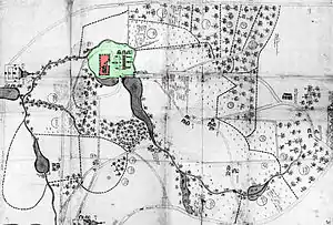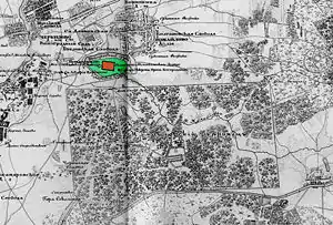 Overall layout of Izmaylovo estate, dictated by the rivers, was irregular, but each individual farm or workshop was designed in a highly symmetrical fashion. The vineyard (55°47′58″N 37°45′1″E / 55.79944°N 37.75028°E), fig tree (55°46′28″N 37°47′10″E / 55.77444°N 37.78611°E) and proso (55°46′19″N 37°49′2″E / 55.77194°N 37.81722°E) farms were set up as regular squares; the 15-acre[2] medicinal herb garden (55°47′4″N 37°46′11″E / 55.78444°N 37.76972°E) and flax farm as perfect circles. The Wolf Farm that raised wild beasts for hunting was protected with a perfectly circular moat (55°46′19″N 37°46′3″E / 55.77194°N 37.76750°E); another, extant, circular moat (55°47′34″N 37°50′8″E / 55.79278°N 37.83556°E) served as a fire reservoir for the brick kilns in the eastern end of the estate; five kilns were placed around the moat in a star pattern. The estate also featured a pure folly, the Babylon - Muscovy's first labyrinth, placed halfway between the Tsar's Court and the Wolf Farm.[5] Wolf Farm, or Menagerie (Russian: Зверинец) housed beasts from sables to polar bears and is thus credited to be Russia's first zoo.[6]