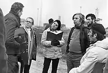 ![]() Actor István Avar (left), director Péter Bacsó (with a scarf) and cinematographer János Zsombolyai (right) on the shooting of the film The Third Run. | |