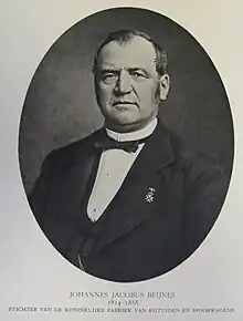 He was the son of J.J. Beijnes the elder who had a carriage shop behind the St. Bavochurch on the Riviervischmarkt in Haarlem. Both he and his brother went to work for his father, though young A.J. became an independent smith in the Grote Houtstraat at number 179.[1] In 1853 both companies were merged, and in 1858 the company's name was changed to Fabriek van Rijtuigen en Spoorwagens J.J. Beijnes when they moved premises to what is now Stationsplein, Haarlem in order to serve their largest customer, the Hollandsche IJzeren Spoorweg-Maatschappij (HIJSM).[1] To service the trains on the rails between Haarlem and Amsterdam, the HIJSM took on the services of the Fabriek van Rijtuigen en Spoorwagens J.J. Beijnes in Haarlem as sole supplier. The locomotive engines were imported, but all of the train cars were built by Beijnes. The company grew so fast, that in 1891, the HIJSM, aided by the social activist Daniel de Clercq, began the Haarlem society called De Ambachtsschool to unify various city efforts to start a vocational school in Haarlem, in order to satisfy their need for workers in the booming train car business.[2]
