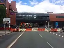 In managing slum clearance, Manchester experienced the same difficulties encountered by Sheffield City Council with shortage of land, but, unlike Sheffield, was opposed to high rise living.[33] Despite concentrating efforts on the refurbishment of existing architecture, rather than demolition and renewal, the area of Hulme had been bulldozed by the 1960s and a vision for Hulme close to that expounded by the Park Hill estate emerged. This was the third major commission for Wilson and Womersley. Recreating a sense of community such as those envisaged in the ‘streets in the sky’ model of Park Hill seemed to be a fitting solution. However, despite planning to combine the social amenities afforded at Park Hill, such as self-contained shops and schooling, pubs, churches and bus stops,[34] Hulme Crescents, completed in 1972, lacked the focus on community that was integral to Womersley's work in Sheffield. Park Hill had exploited the hills surrounding Sheffield city centre for practical and scenic effect: Manchester offered no such opportunity. Moreover, the population was effectively cut off from the rest of the city with the development of the Princess parkway and Mancunian Way; the new building techniques were poorly understood and imperfectly applied.[35] The progressive collapse of Ronan Point high rise flats in London due to a gas explosion resulted in all similar concrete panel system-built schemes having to replace gas central heating with electric heating which tenants could not afford to use, leading to rampant condensation. The resultant problems with damp and poor sewerage system attracted vermin and social deprivation accompanied. They were demolished less than 20 years later.