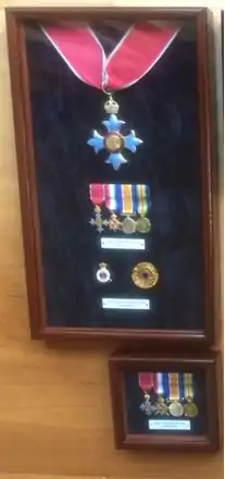 Jack Beddington’s medals to the right include the miniatures of the same below. The large blue neck decoration is the CBE – Commander of the Most Excellent Order of the British Empire awarded in 1943 for services to the war effort as a civilian. In the 3rd row of the top case are Carol Lobb’s (nee Beddington) WWII medals from serving as a code breaker at Bletchley Park. She was the daughter of Jack and Olivia.