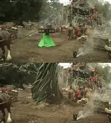 The film's special effects were completed by seven different visual effects houses: Digital Domain, Giant Studios, The Third Floor, MPC, Soho VFX, Rodeo FX and Hatch Productions.[30] Creating the giants took four main steps. The first step was Pre-Capture, in which performance capture was used to capture the actor's facial and body movements and render them in a real-time virtual environment. The second step took place during principal photography, where Simulcam technology was used to help the human characters virtually interact with the giants that were rendered earlier in Pre-Capture. The third step was Post-Capture, a second performance capture shoot to adjust giants' movements to seamlessly fit the live-action performances. The final step involved putting the finishing touches on the giant's animation, skin, hair and clothing, and composition in the shots.[30] Creating the beanstalk involved two main requirements: set extension for shots of the actors interacting with the beanstalk, which were shot against a bluescreen, and complete CG renderings for shots of the beanstalk growing and extending from Earth into the world of the giants.[30]