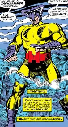 Jackhammer is a costumed agent/division leader of HYDRA when it was under the leadership of the crime lord Silvermane. When they arranged a kidnapping of Foggy Nelson, Daredevil, Black Widow, and S.H.I.E.L.D. pursued them. Jackhammer was among those who fought Daredevil and was defeated.[1]
