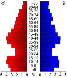 In the county, the population was spread out, with 26.00% under the age of 18, 7.00% from 18 to 24, 26.50% from 25 to 44, 23.20% from 45 to 64, and 17.30% who were 65 years of age or older. The median age was 39 years. For every 100 females there were 97.10 males. For every 100 females age 18 and over, there were 93.90 males.
