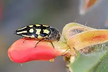 Jacksonia is an erect shrub, growing from 1.5 m to 2.5 m high on white or grey sands.[1] Its yellow and red flowers are seen in April.[1]