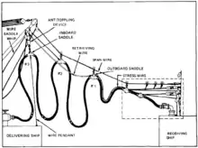 - Support and guidance for transfer of personnel and materials between vessels at sea (Replenishment at sea), suspended from a traveller block and controlled by lines running in both directions.[1]