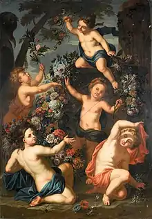 Jacob Melchior van Herck was a painter of flower and fruit still lifes. He regularly collaborated with figure painters in the creation of allegorical and mythological scenes, which incorporated important still life elements. His collaborators included François Liberti and possibly, Peter Ykens. Several of these collaborations feature putti in an outdoor setting or allegorical figures.[8][9] He also collaborated on portraits such as the Portrait of Maria Luisa of Savoy (At Christie's, 13 December 2002, London, Lot 262). The portrait was likely painted by François Liberti while van Herck took care of the still life elements.[10]