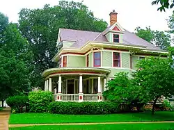 The 1901 house sits on the same limestone foundation as the 1884 house, but the frame structure is a different Queen Anne style design, 2.5 stories with bay windows, broad eaves, pedimented dormers, and a complex roof. On the southeast corner is a large one-story round veranda with its roof supported by seven Doric columns. The walls are clad in narrow clapboard, with bands of sawtooth shingles. Inside are parquet floors, a built-in china cabinet, a tiled fireplace, a mural, stenciling, and an ornate main staircase.[3]