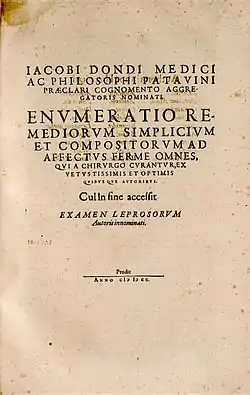 The most celebrated work of Jacopo Dondi is the Aggregator or Promptuarium medicinae ed Enumeratio remediorum simplicium et compositorum, completed in 1355 and conserved in manuscript in the Vatican (Vat. lat. 2462, 14th century), the Collegio di Spagna, Bologna (MS 153, dated 1425) and the Bibliothèque Nationale in Paris (Lat. 6973 and 6974). It was published in Strasburg in about 1470 by the "R-printer" (Adolph Rusch) and in Venice in 1481 by Michele Manzolo. It was reprinted in Venice in 1542 by Tommaso and Giovanni Maria Giunta, and again in 1576. The section on surgery, Enumeratio remediorum simplicium et compositorum ad affectus omnes qui a chirurgo curantur, was included in the Chirurgia: de chirurgia scriptores optimi quique veteres et recentiores of Conrad Gesner, printed at Zurich in 1555 by his cousins Andreas and Iacobus Gesner,[3] and in the Thesaurus chirurgiae of Peter Uffenbach (1610).[1][4]