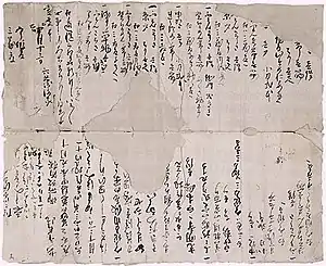 Other surviving letters include one of 1665 by Fuku (ふく), widow of Rokubee (六兵衛), to Tanimura Gorōsaku (谷村五郎作) and Sanzō (三蔵); and that on an embroidered silk fukusa enclosing a box of tea, from Koshoro (コショロ), now at the Hirado Dutch Trading Post.[1][2][3][4][5]