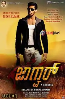 Jaguar is a 2016 Indian vigilante action film, produced by H. D. Kumaraswamy[5] under his banner Channambika Films and directed by Mahadev. Shot simultaneously in Kannada and Telugu, it features Nikhil Gowda, who is the son of the producer H. D. Kumaraswamy, and Deepti Sati in the lead roles, while Tamannaah Bhatia made a cameo appearance with this film, thus marking her debut in Kannada cinema. The music was composed by S. Thaman, and action sequences were choreographed by Ram-Lakshman.[6][7][8]