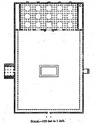Built with yellow sandstone, the mosque complex is centered on a large rectangular courtyard 75 m long and 66 m wide. One enters the court by three entrances: south, east, and north.[1][2] One at the center of each side. The primary entrance is the south facing entrance; the eastern porched entrance leads out to another enclosure, the tomb of Sultan Ahmad Shah I.[1] The courtyard is lined with a colonnade on three sides, the prayer hall occupies the western side.[4] In the center of the courtyard is a rectangular basin for ablutions.[2]