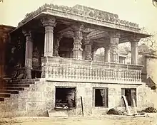 The southern porch entrance to the mosque is large and supported by pillars, some of which were reused from Hindu or Jain temples. The porch is elavated with twelve steps on each side. It is topped by a roof that once had a dome which has since collapsed.[6]